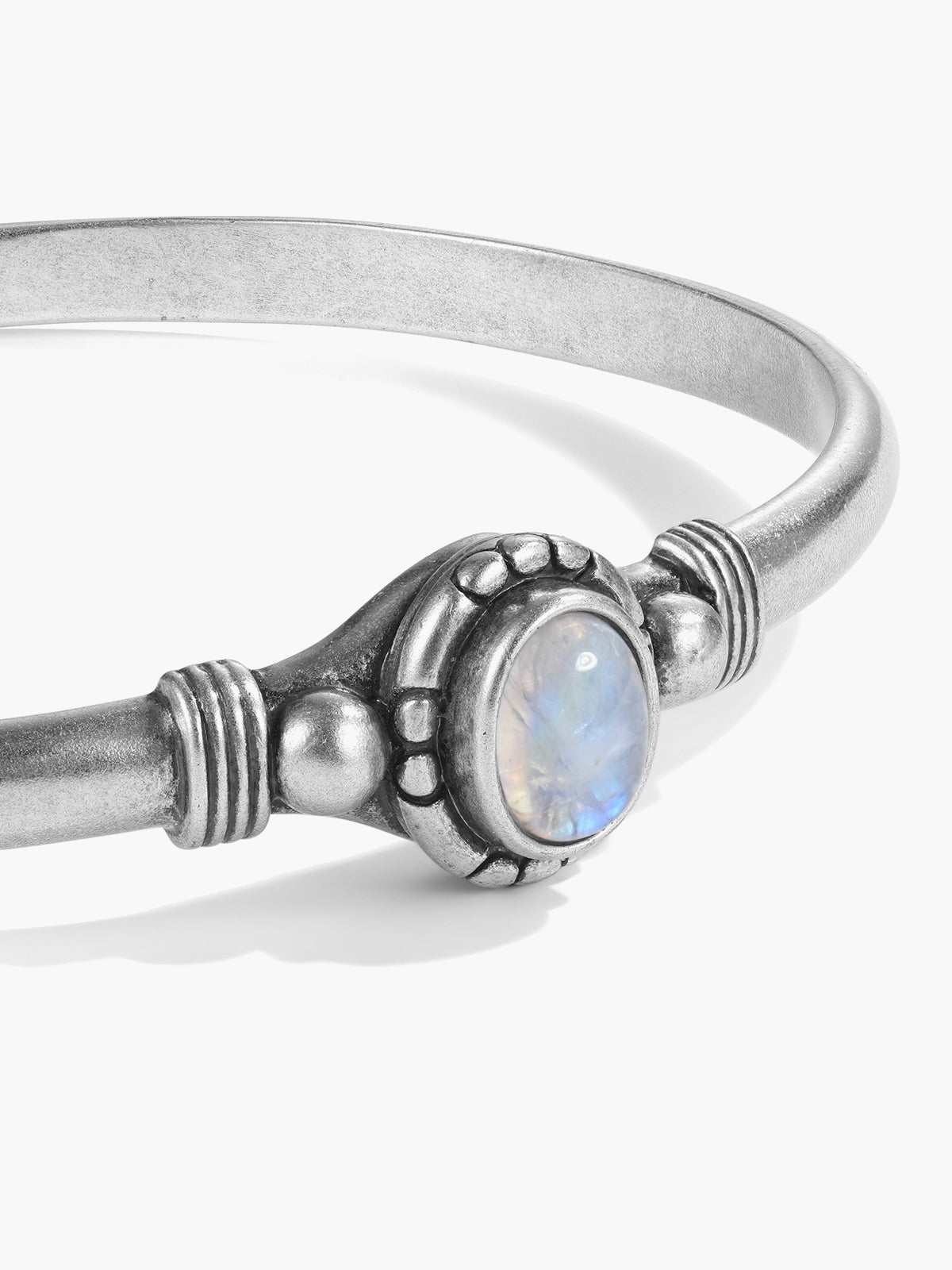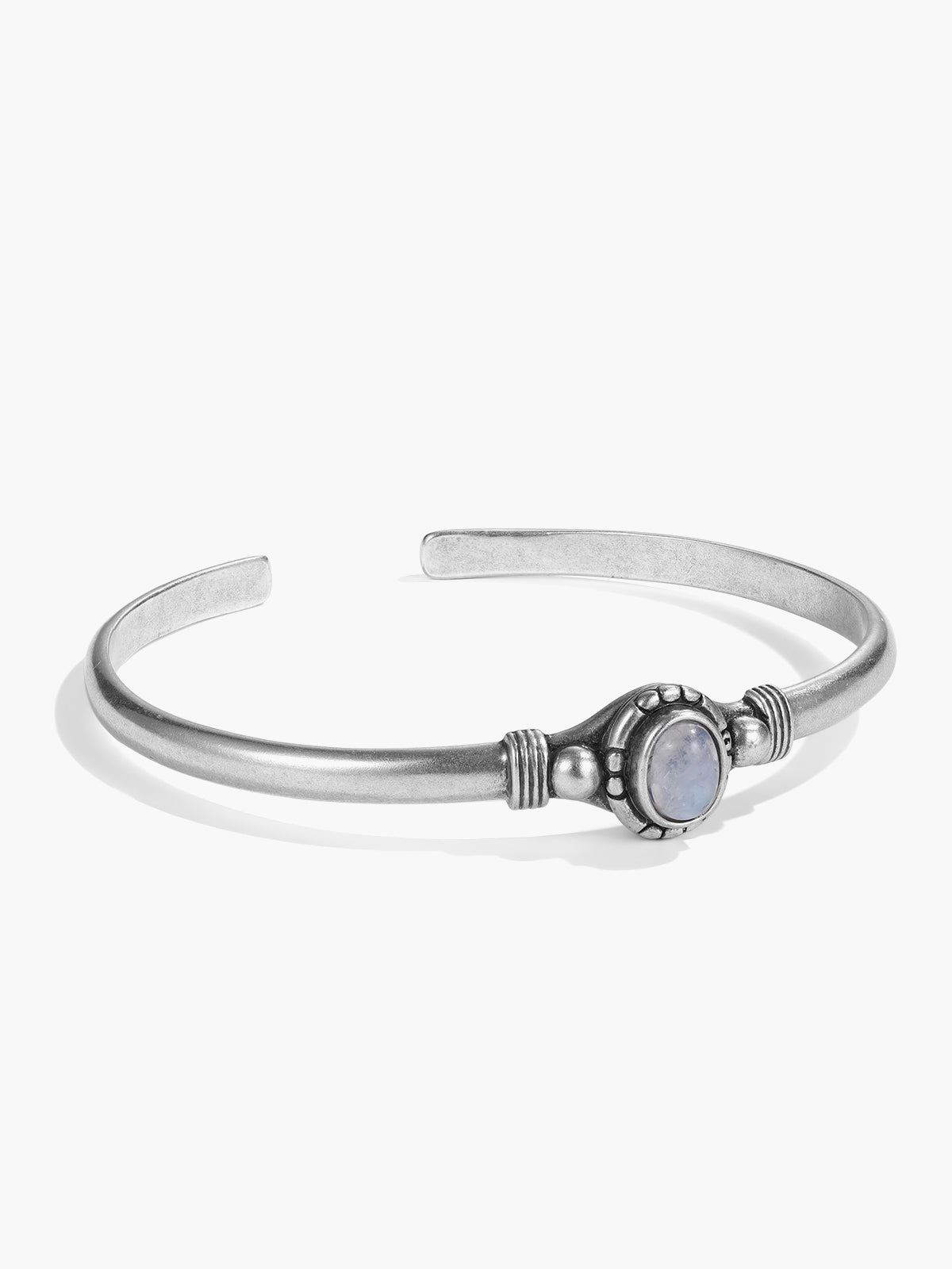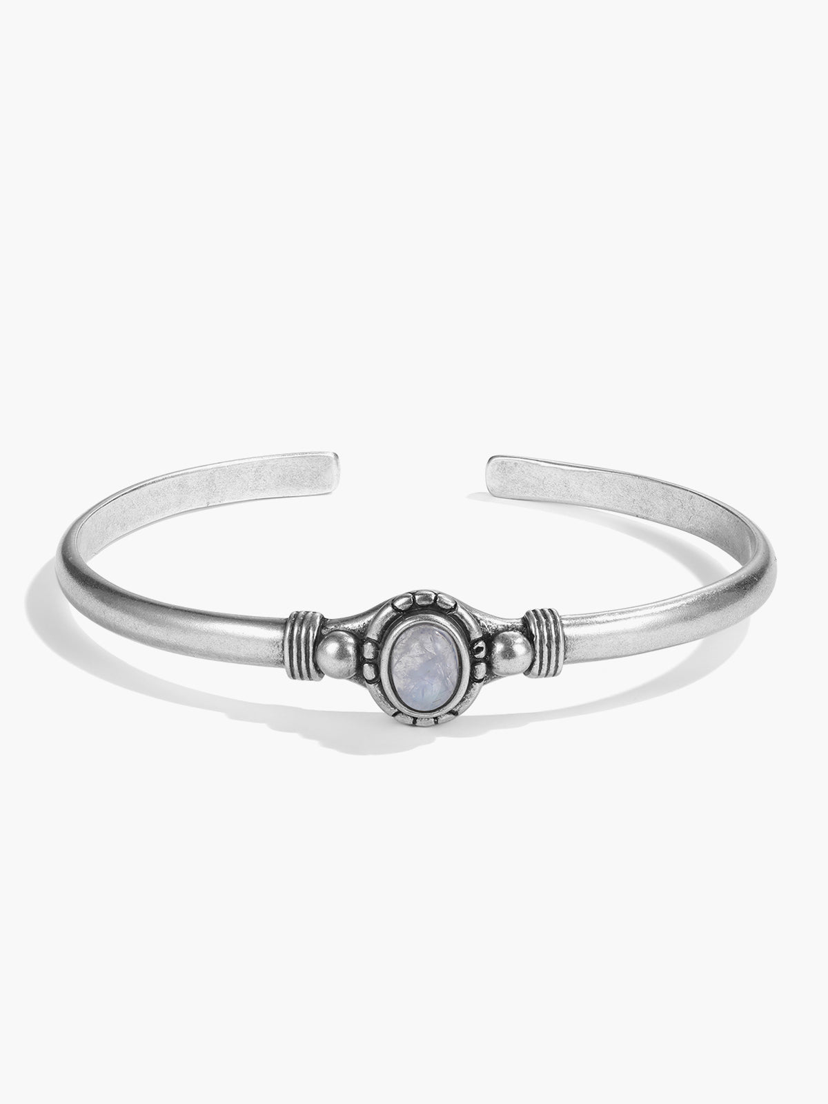 Crafted from brushed silver-tone metal, this open cuff design exudes elegance and simplicity while highlighting a captivating, oval-shaped moonstone at its center.
