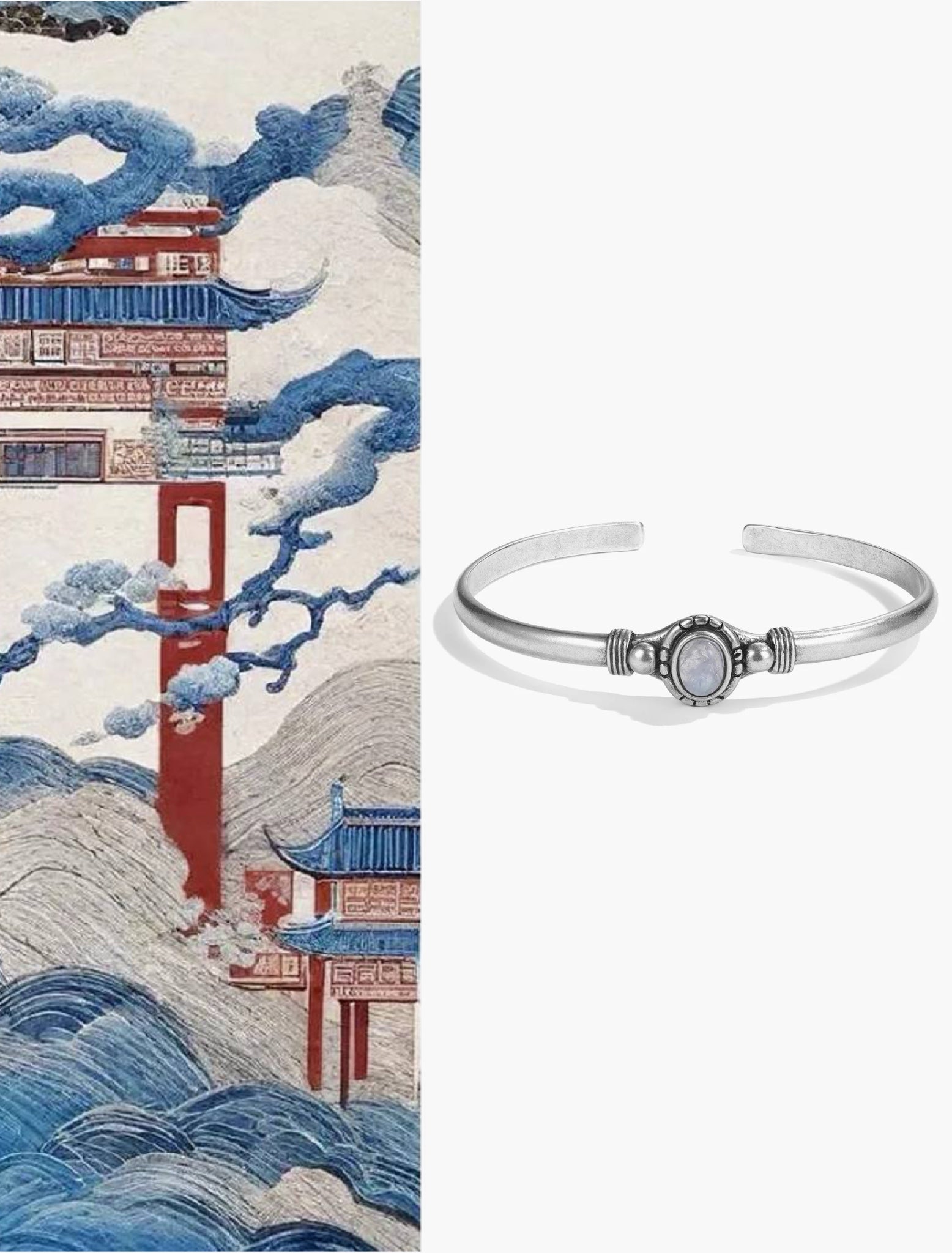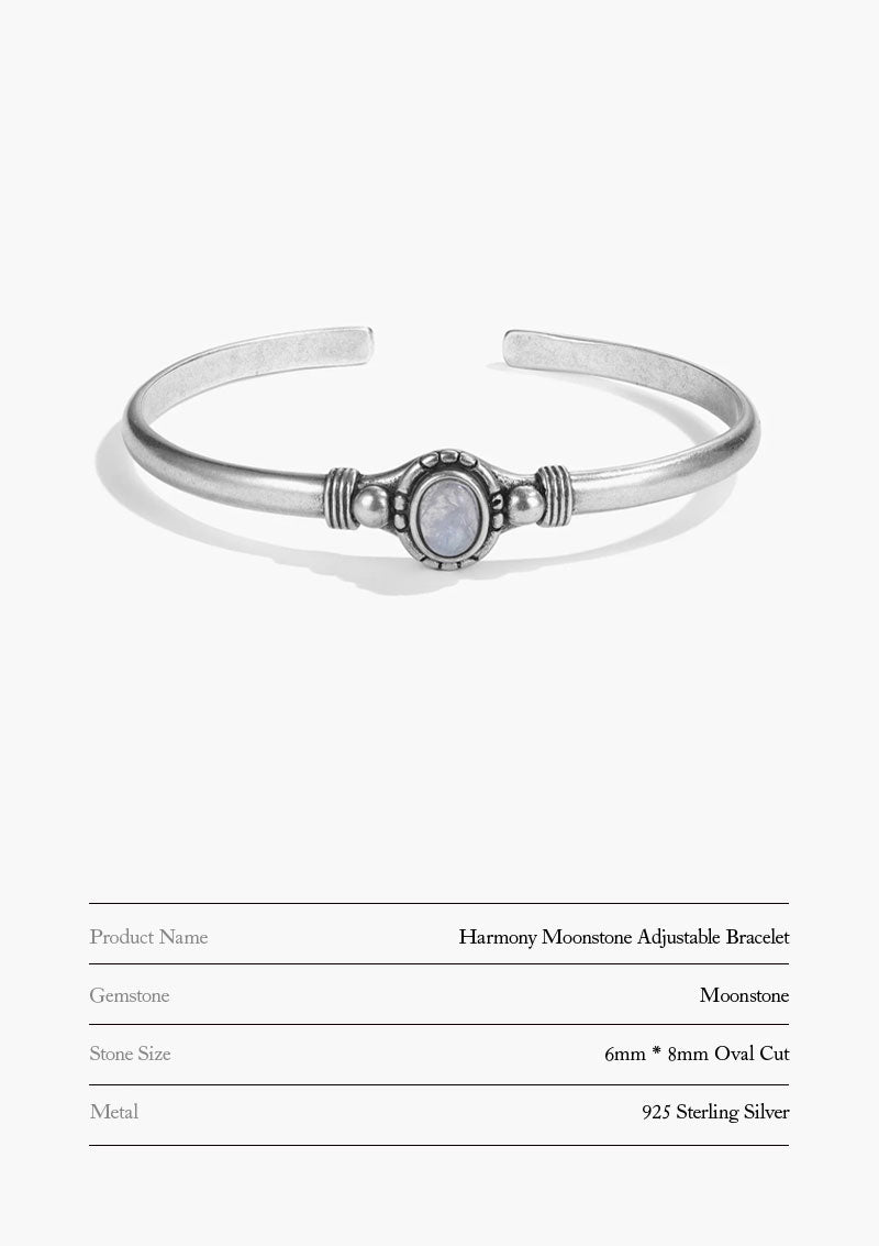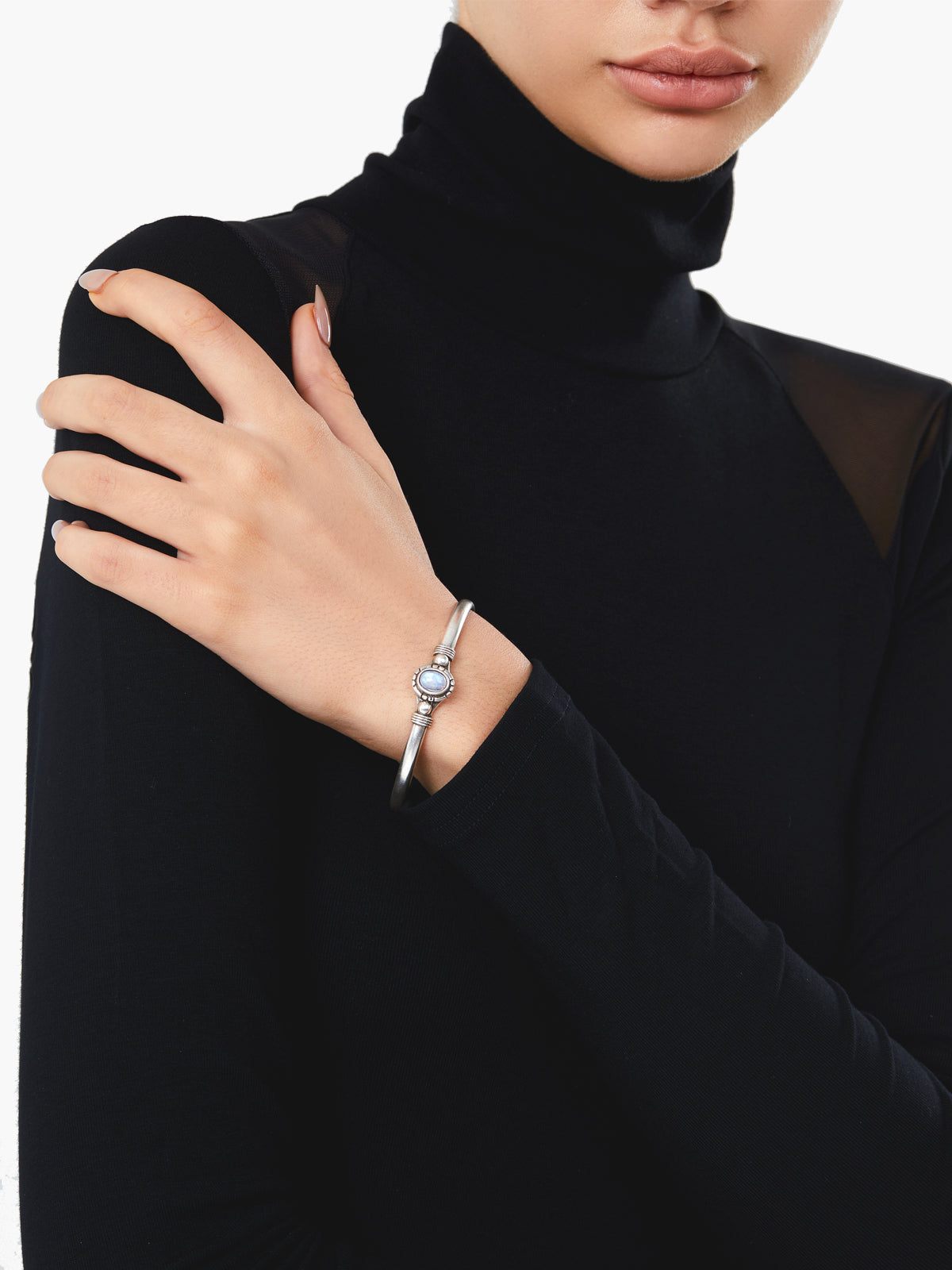 This sterling silver moonstone bracelet is the perfect blend of elegance and tranquility. The smooth silver band is beautifully complemented by the oval moonstone at the center, giving it a sleek and timeless design. The moonstone's soft glow promotes balance and calm, making it ideal for daily wear. It feels like wearing a piece of peace on my wrist.