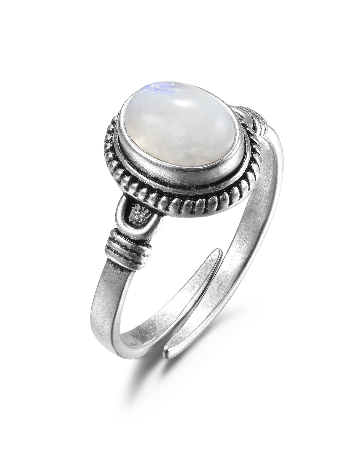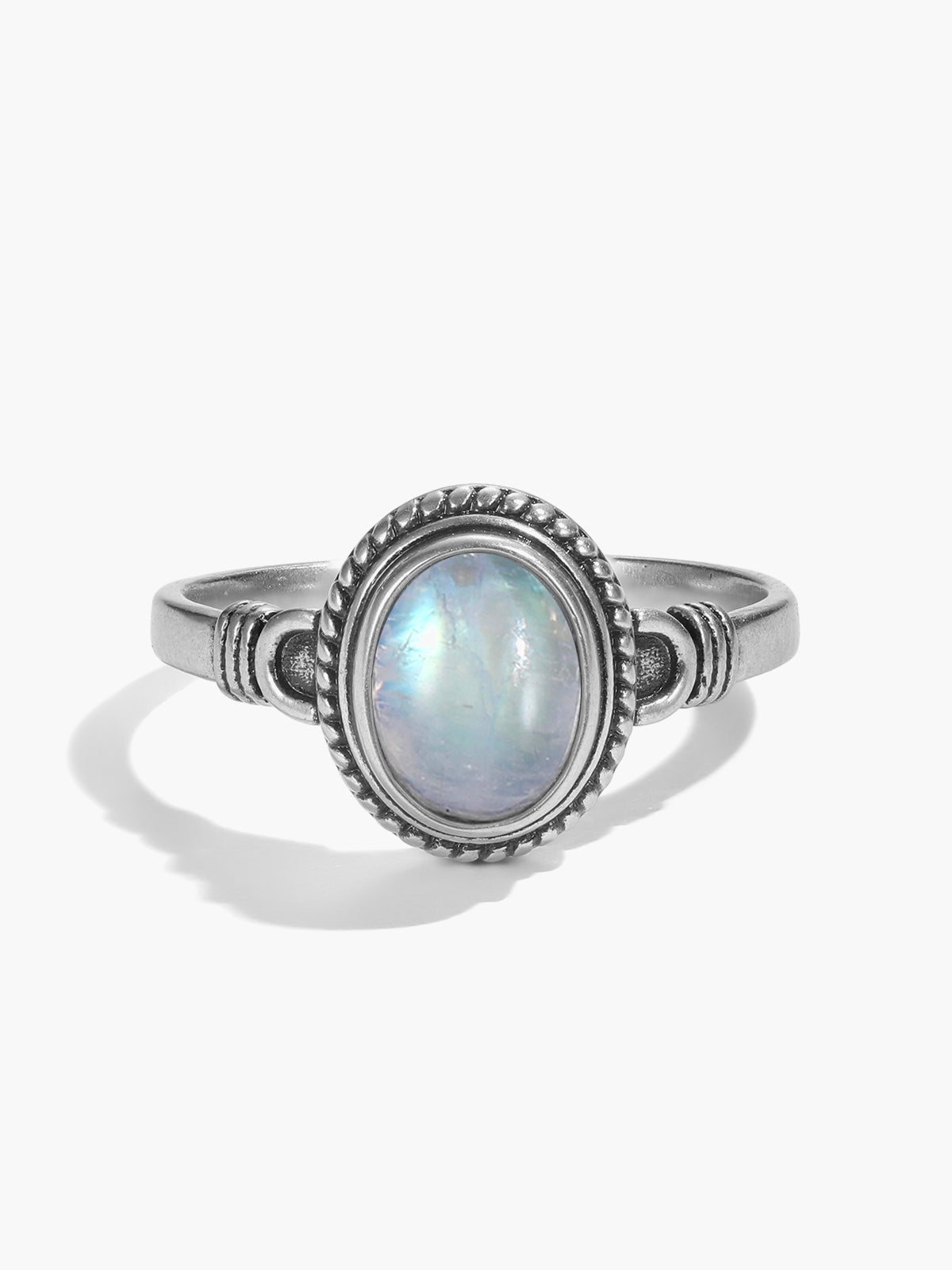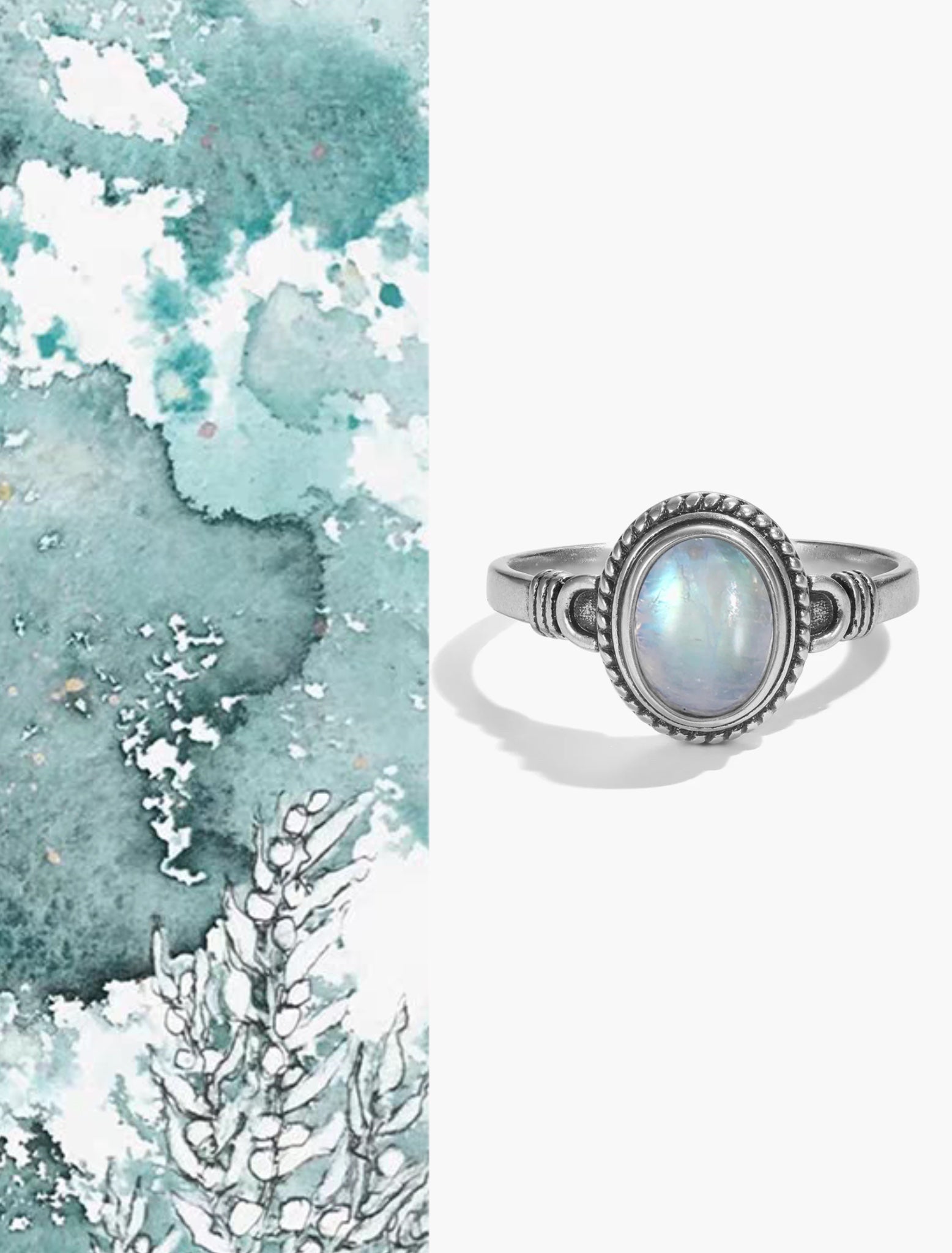 This exquisite ring features an oval moonstone centerpiece set in a brushed silver-tone band, designed to capture the soft, ethereal glow of moonlit Himalayan nights.