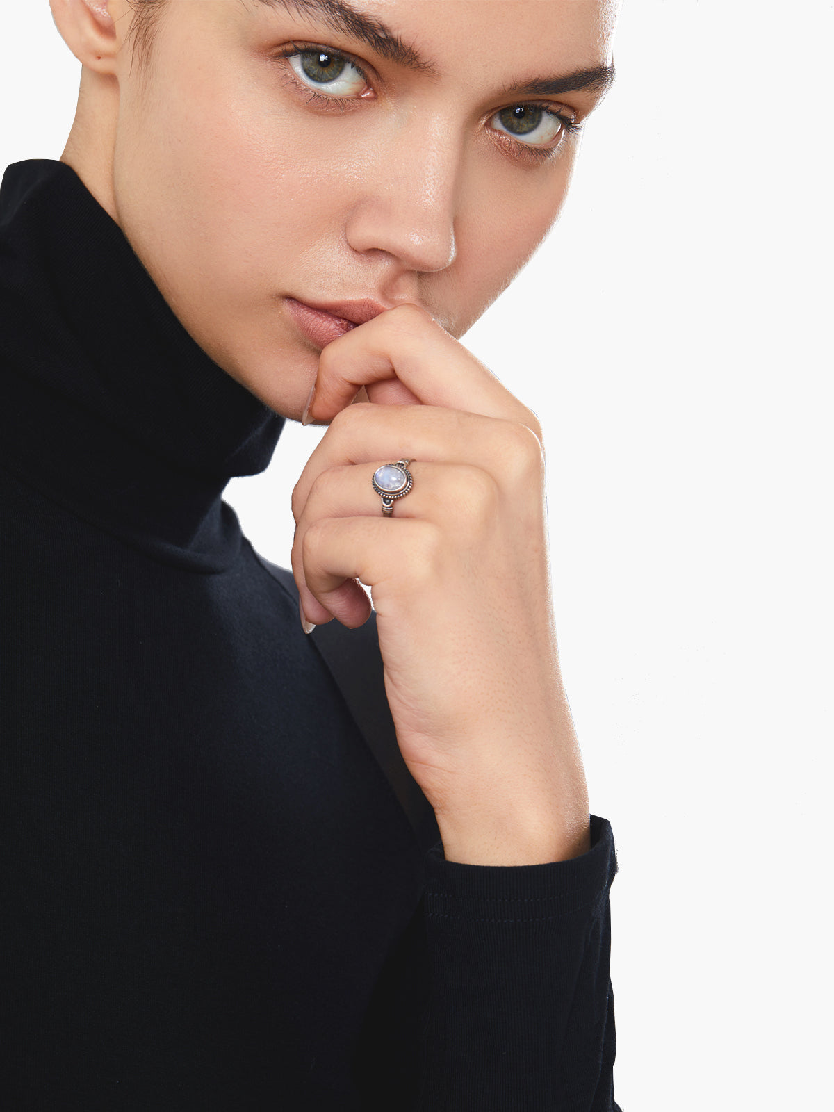 The stone’s gentle shimmer reflects a sense of calm and timeless elegance, perfect for everyday wear or special occasions.