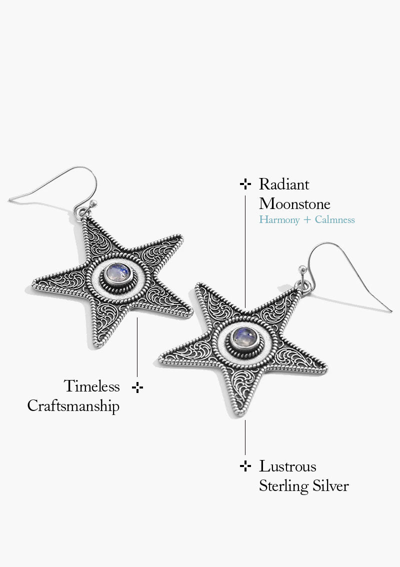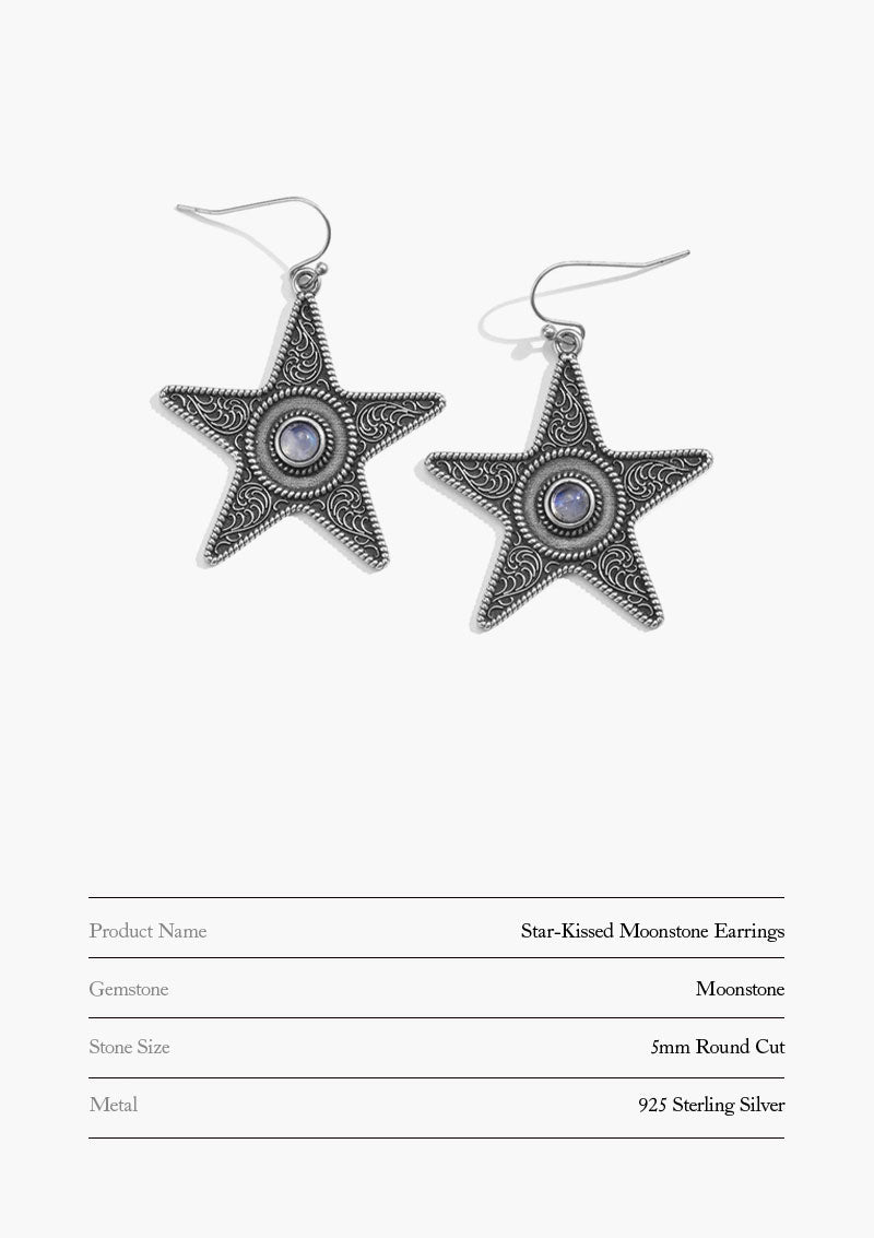 Star-Kissed Moonstone Earrings feature a beautifully detailed star shape that captures the essence of the night sky, reminiscent of the starry vistas visible from the majestic mountain peaks.