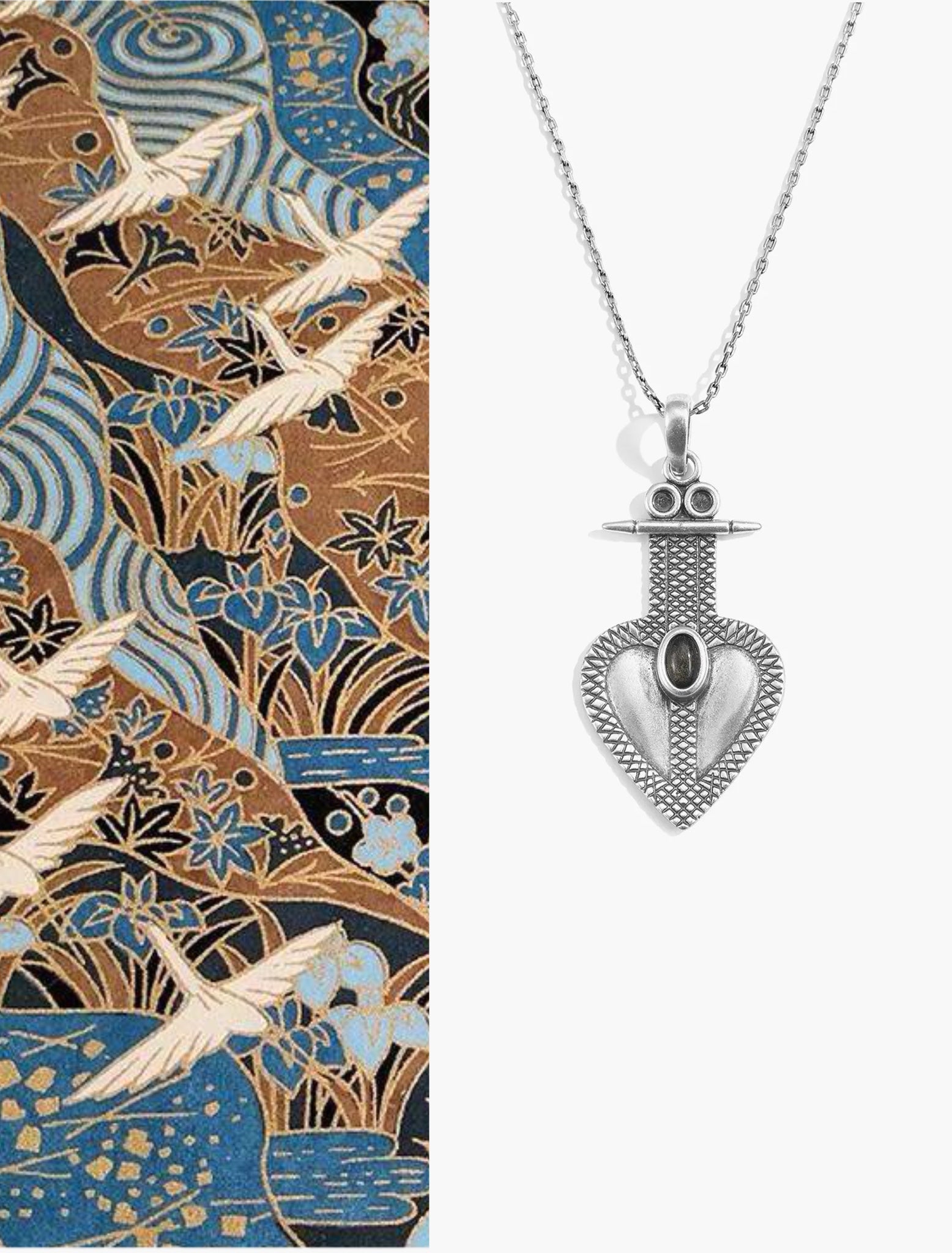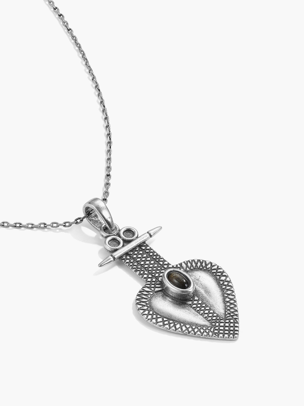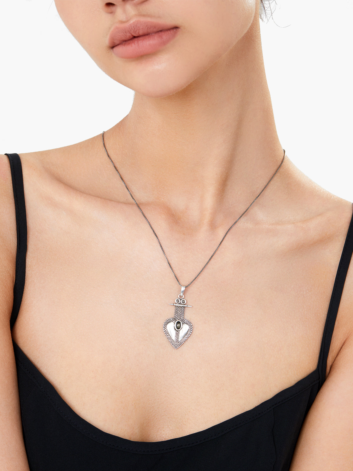 This necklace features a finely textured silver heart pendant, inspired by ancient Himalayan motifs, symbolizing strength and grounding.