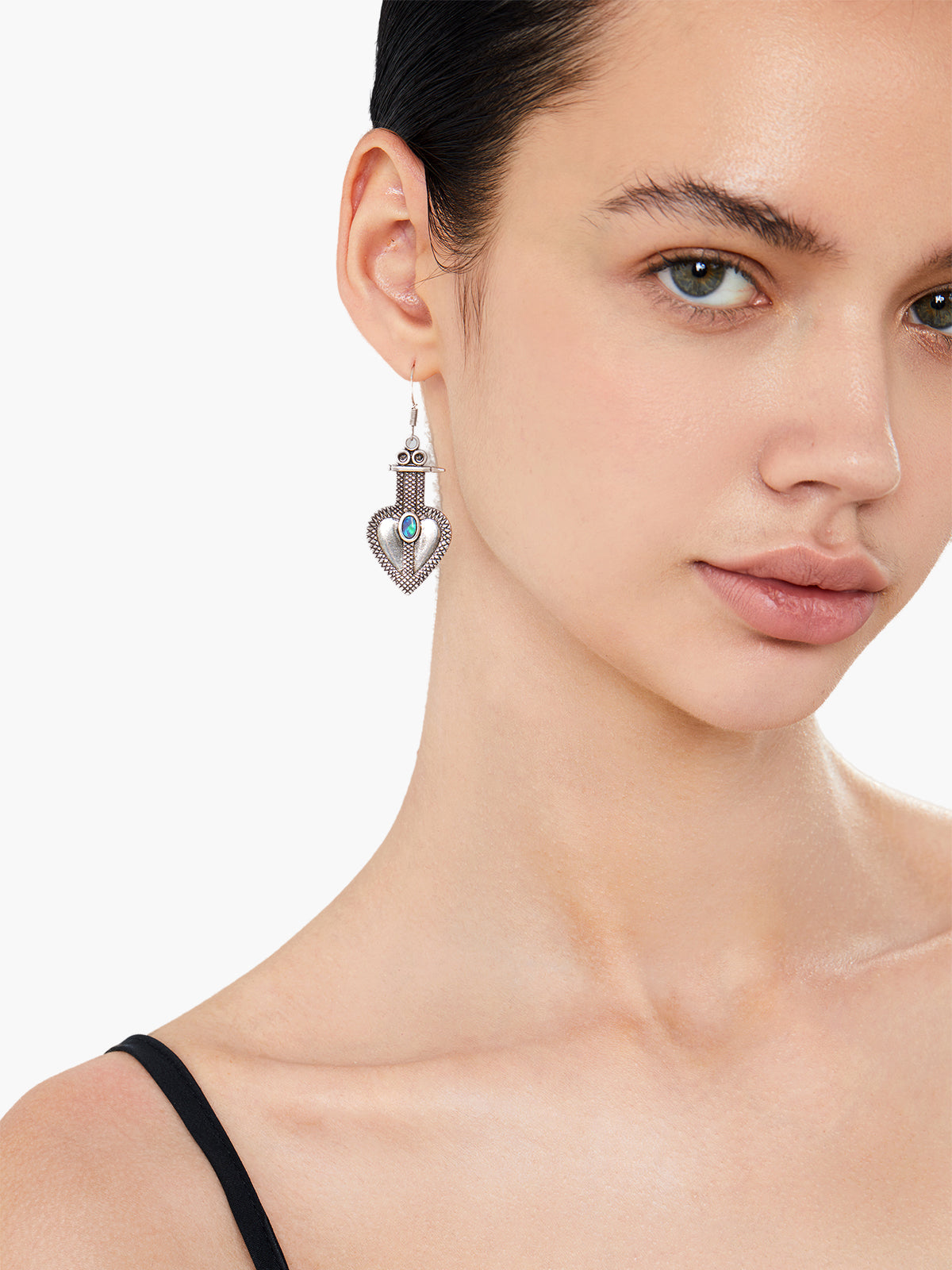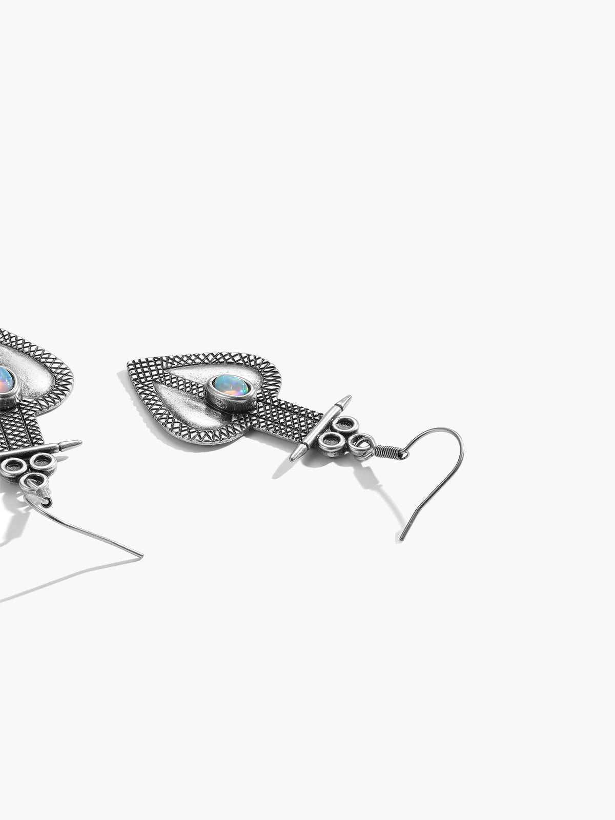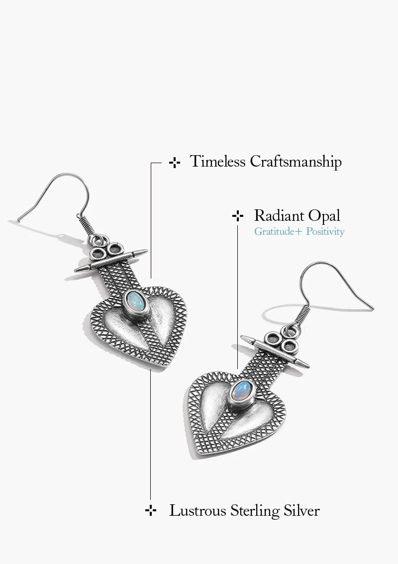 These earrings feature intricately detailed silver heart motifs inspired by traditional Himalayan craftsmanship, each adorned with a radiant opal at the center. Known for its captivating play of colors, the opal shimmers with hues of blue, green, and pink, evoking the magic of distant mountain skies.