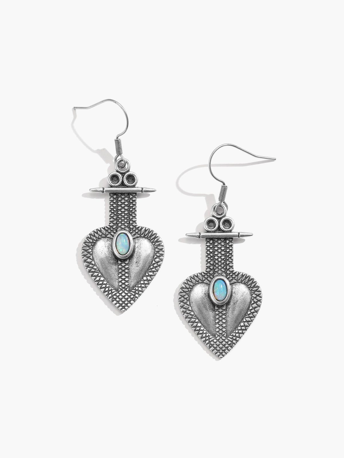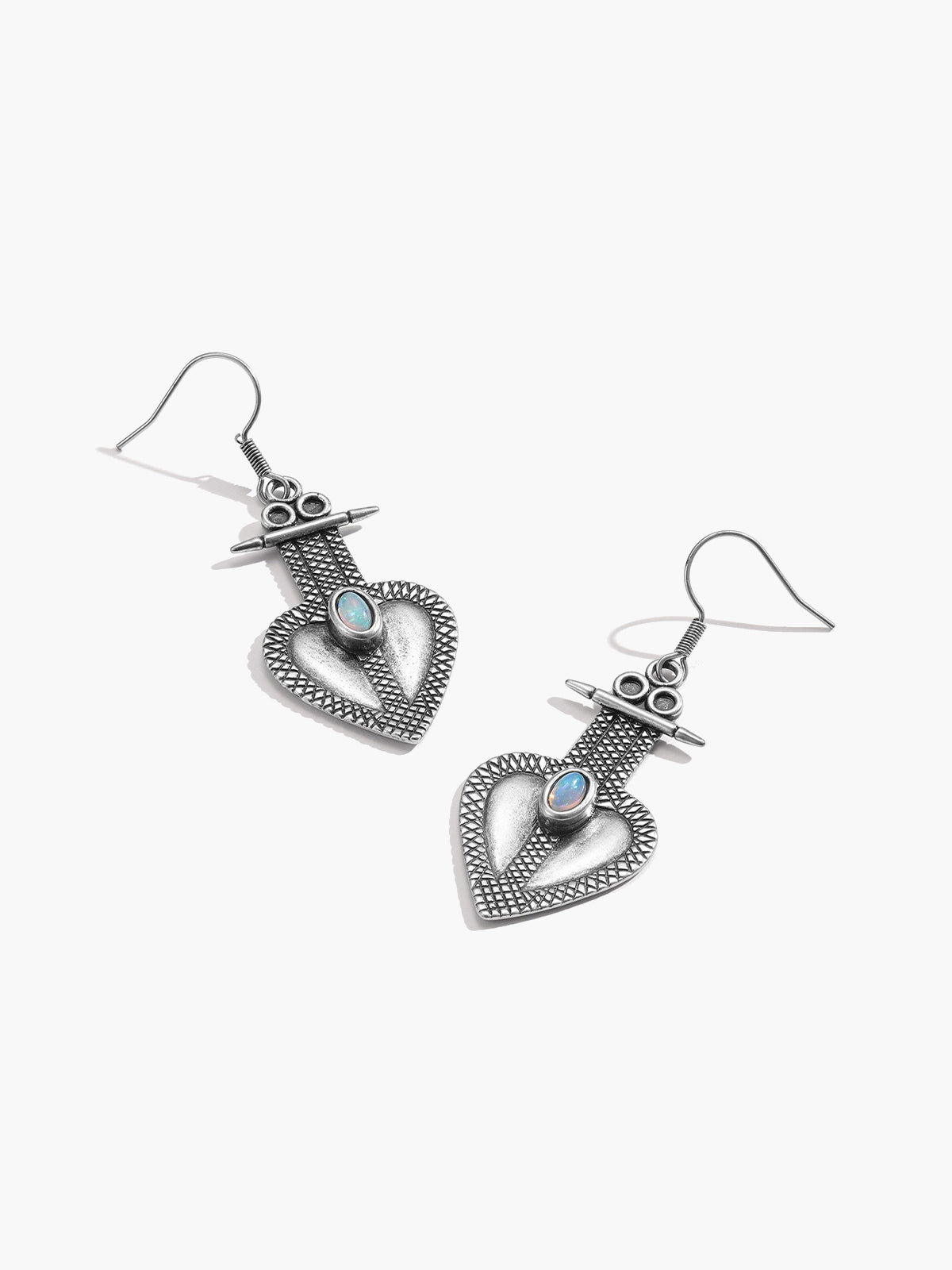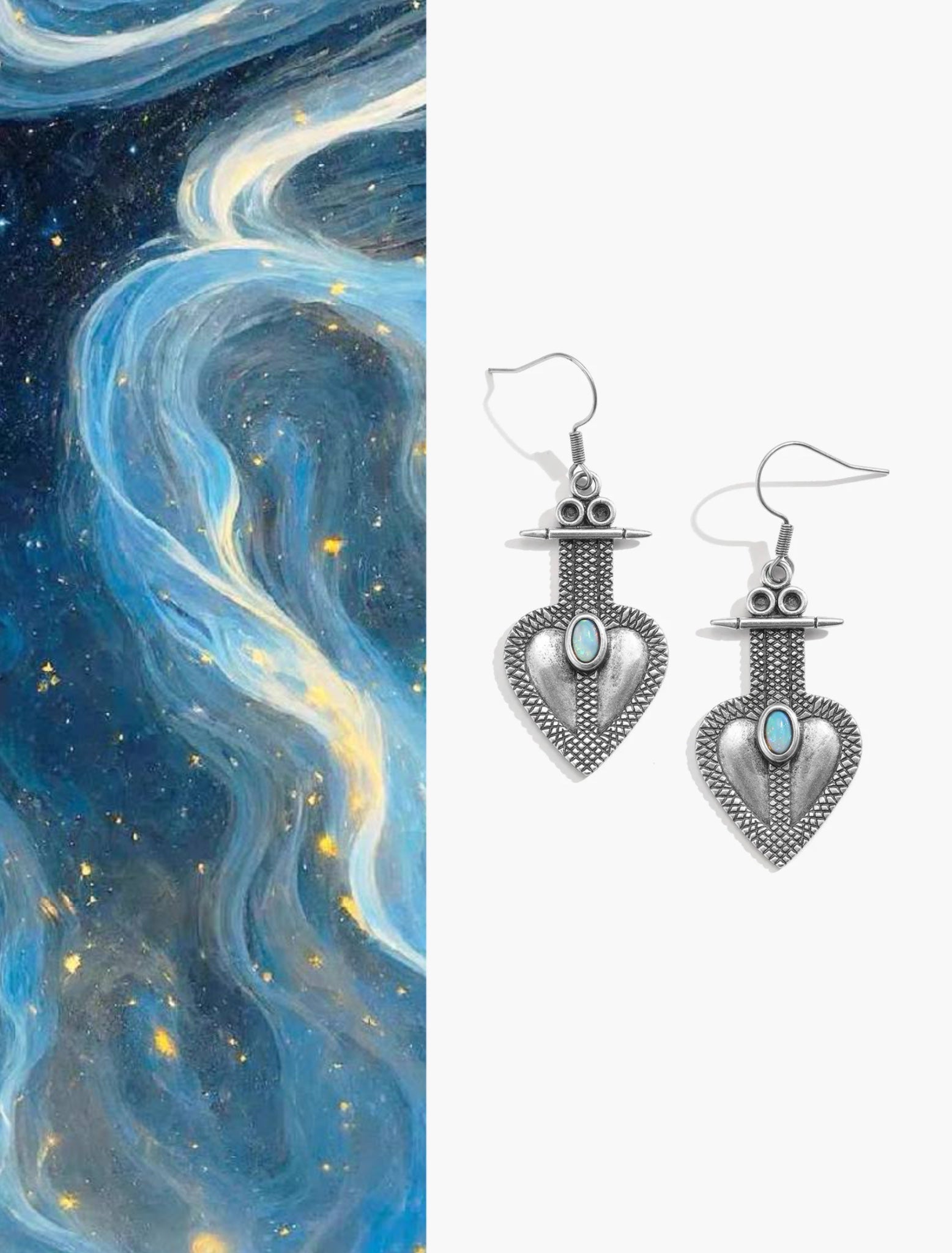 These earrings feature intricately detailed silver heart motifs inspired by traditional Himalayan craftsmanship, each adorned with a radiant opal at the center. Known for its captivating play of colors, the opal shimmers with hues of blue, green, and pink, evoking the magic of distant mountain skies.